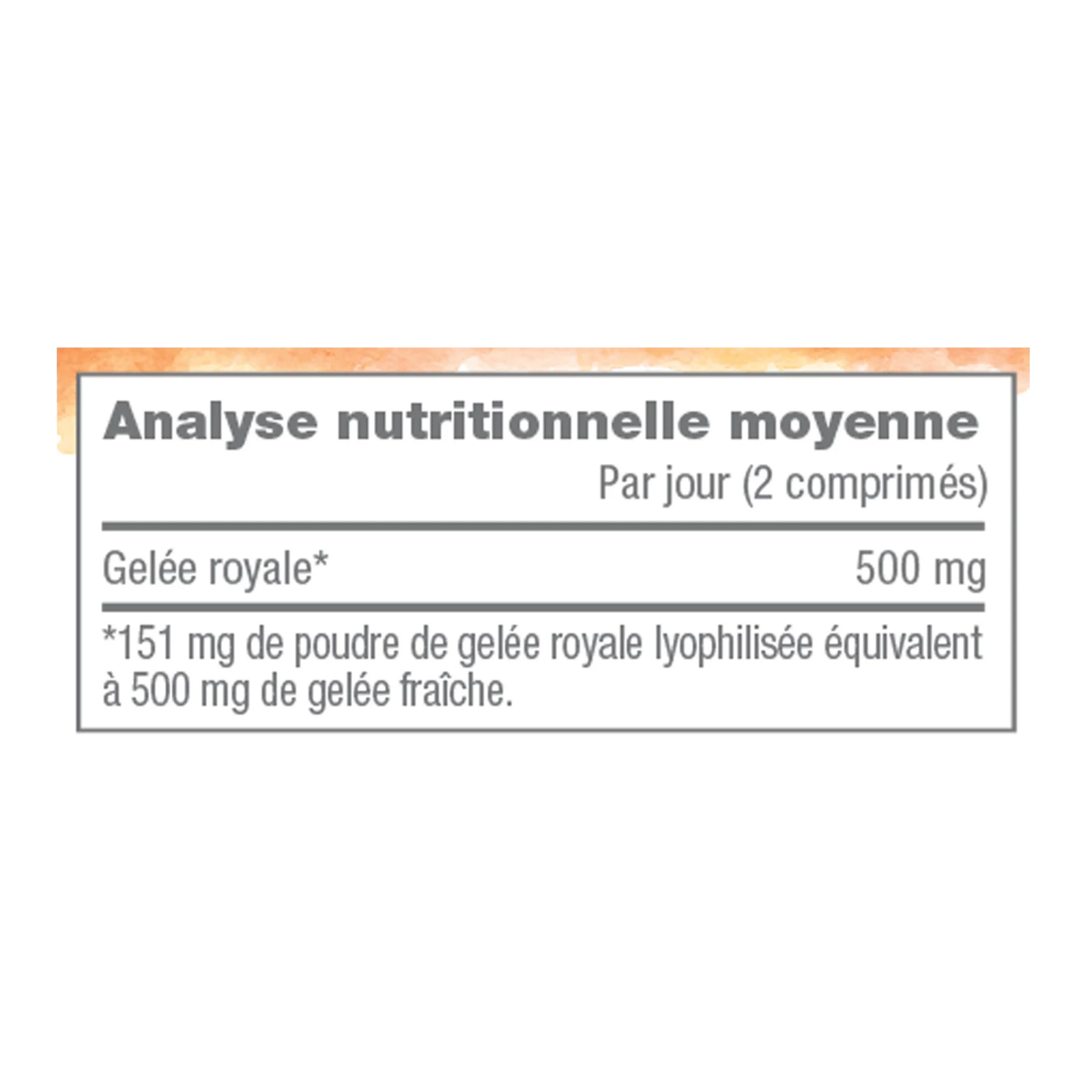 مُحليات: سوربيتول، فركتوز، رويال جيلي مجفف بالتجميد، مُحمض: حمض الستريك، منكه برتقال، مستحلب: حمض دهني، مواد مضادة للتكتل: أملاح المغنيسيوم للأحماض الدهنية، ثاني أكسيد السيليكون.