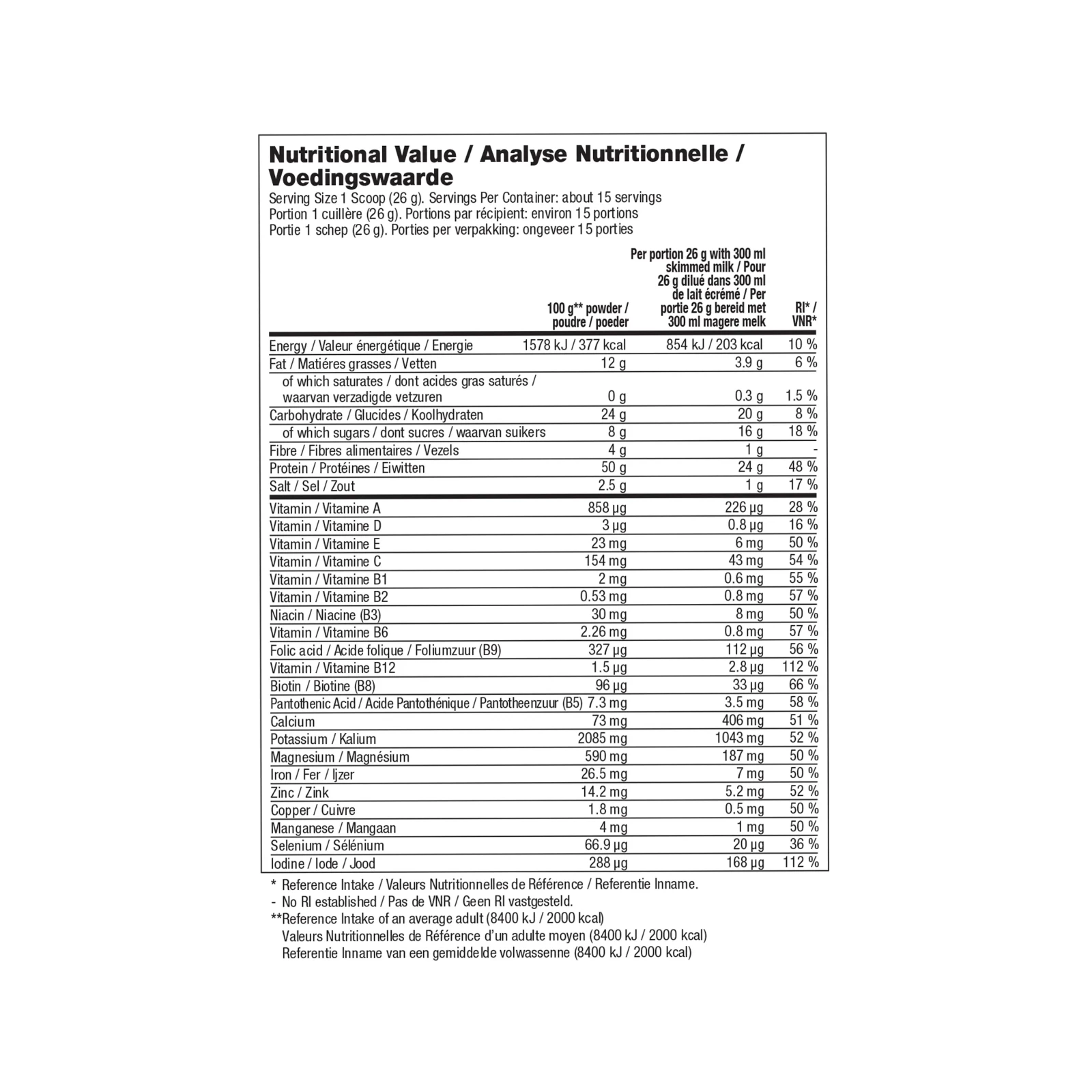 بروتين الصويا المعزول (ليسيثين الصويا)، مُكثف كريمي (زيت دوار الشمس، مالتوديكسترين، نشاء معدل، مستحلب: مونو وجليسريدات الأحماض الدهنية، مضاد أكسدة: حمض الستريك، مادة مضادة للتكتل: فوسفات ثلاثي الكالسيوم)، فركتوز، منكه الشوكولاتة، فوسفات ثلاثي البوتاسيوم، مسحوق الكاكاو منخفض الدهون، فركتوليجوساكاريد، فوسفات ثلاثي الصوديوم، مكثف: صمغ الغوار، أكسيد المغنيسيوم، مزيج إنزيمات البروتيز، مستحلب: ليسيثين الصويا، مُحلي: سوكرالوز، كربونات الكالسيوم، حمض الأسكوربيك (فيتامين C)، فومارات الحديد، أسيتات د-ألفا توكوفيرول (فيتامين E) (نشا الذرة المعدل، مادة مضادة للتكتل: ثاني أكسيد السيليكون)، نياسيناميد (فيتامين B3)، يوديد البوتاسيوم (عامل ملء: فوسفات ثنائي الكالسيوم)، أكسيد الزنك، كبريتات المنغنيز، بيوتين (فيتامين B8) (عامل ملء: فوسفات ثنائي الكالسيوم)، كالسيوم دي-بانتوثينات (فيتامين B5)، بالميتات الريتينيل (فيتامين A) (مضاد أكسدة: DL-ألفا توكوفيرول، منظم الحموضة: فوسفات ثلاثي الكالسيوم، صمغ الأكاسيا، سكر، نشا الذرة)، كبريتات النحاس، خميرة البيرة، هيدروكلوريد البيريدوكسين (فيتامين B6)، هيدروكلوريد الثيامين (فيتامين B1)، كوليكالسيفيرول (فيتامين D) (نشا معدل، سكر، زيت جوز الهند، مضادات أكسدة: أسكوربات الصوديوم، DL-ألفا توكوفيرول، مادة مضادة للتكتل: ثاني أكسيد السيليكون)، ريبوفلافين (فيتامين B2)، حمض الفوليك (فيتامين B9)، سيلينيت الصوديوم، سيانوكوبالامين (فيتامين B12) (عامل تبادل: مانيتول).