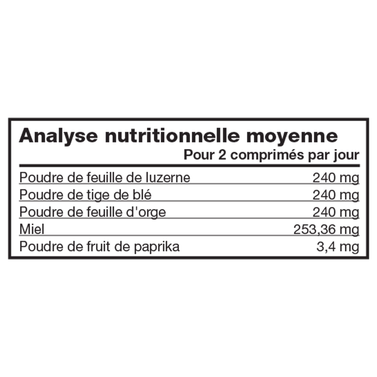 Sweeteners: Sorbitol, Honey; Barley Leaf Powder (Hordeum vulgare), Wheat Stem Powder (Triticum aestivum), Alfalfa Leaf Powder (Medicago sativa); Anti-caking Agents: Magnesium Salts of Fatty Acids, Silicon Dioxide, Fatty Acids; Sweet Pepper Fruit Powder (Capsicum annuum L.).